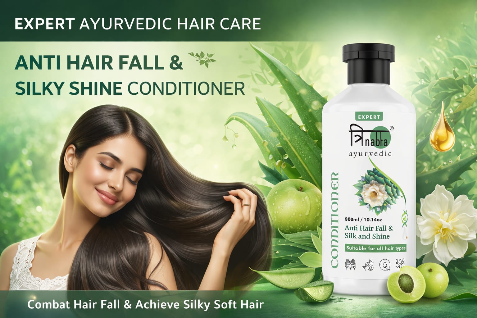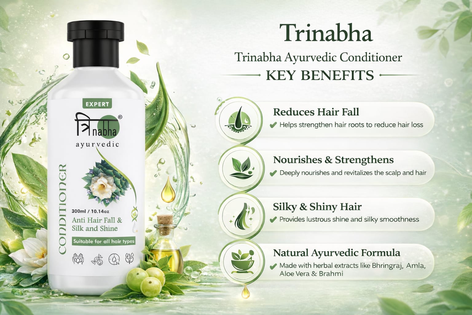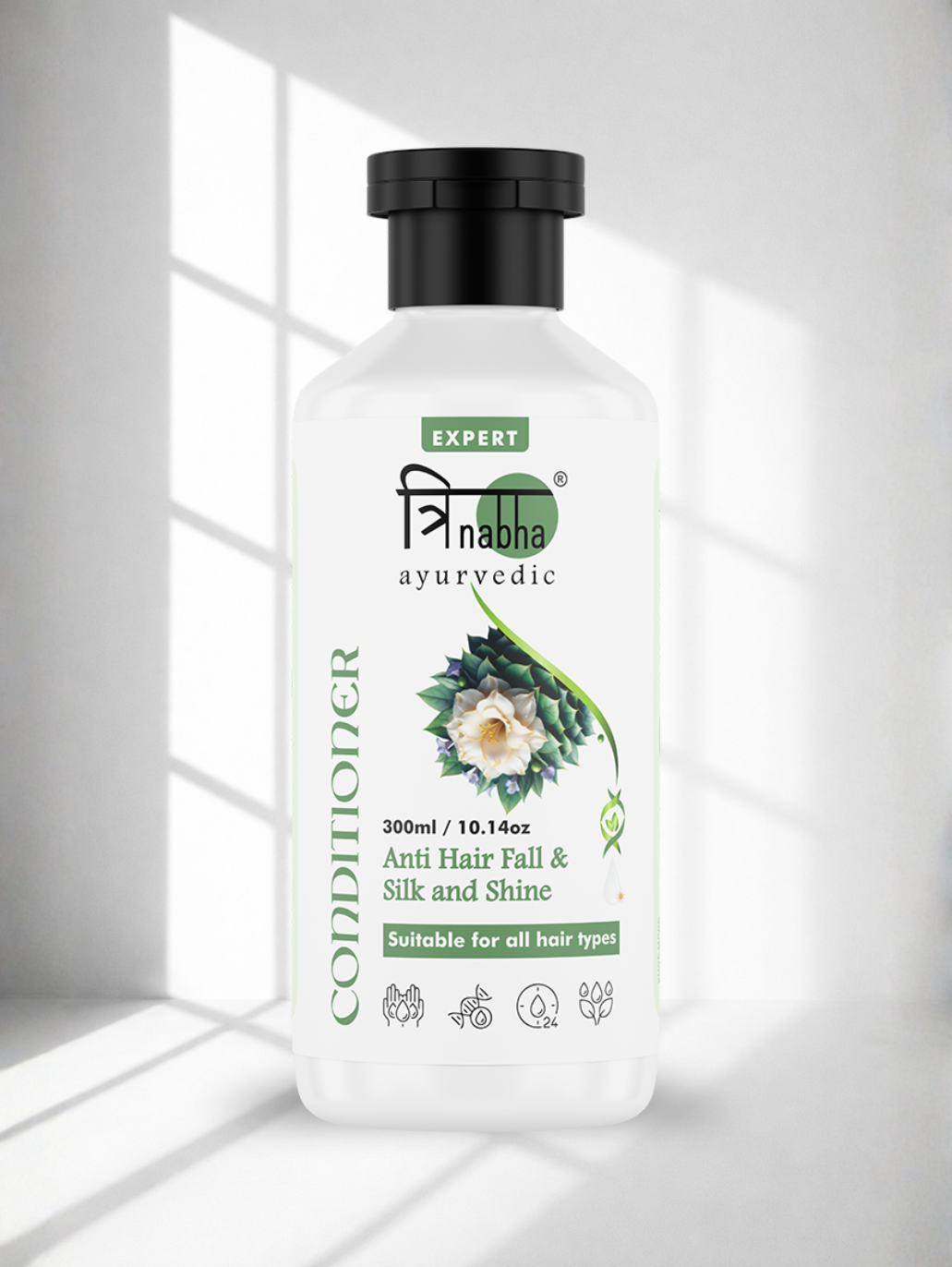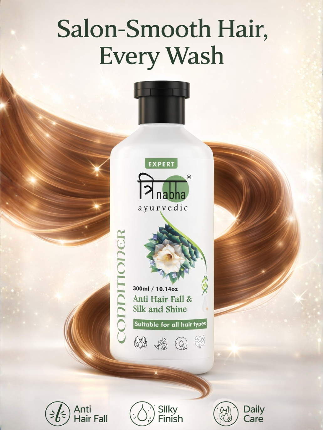 Trinabha Ayurvedic Anti Hair Fall & Silk and Shine Conditioner is a deeply nourishing hair care formula enriched with Ayurvedic ingredients to strengthen hair, reduce breakage, and restore natural softness and shine. It deeply conditions hair strands while improving manageability and smoothness.