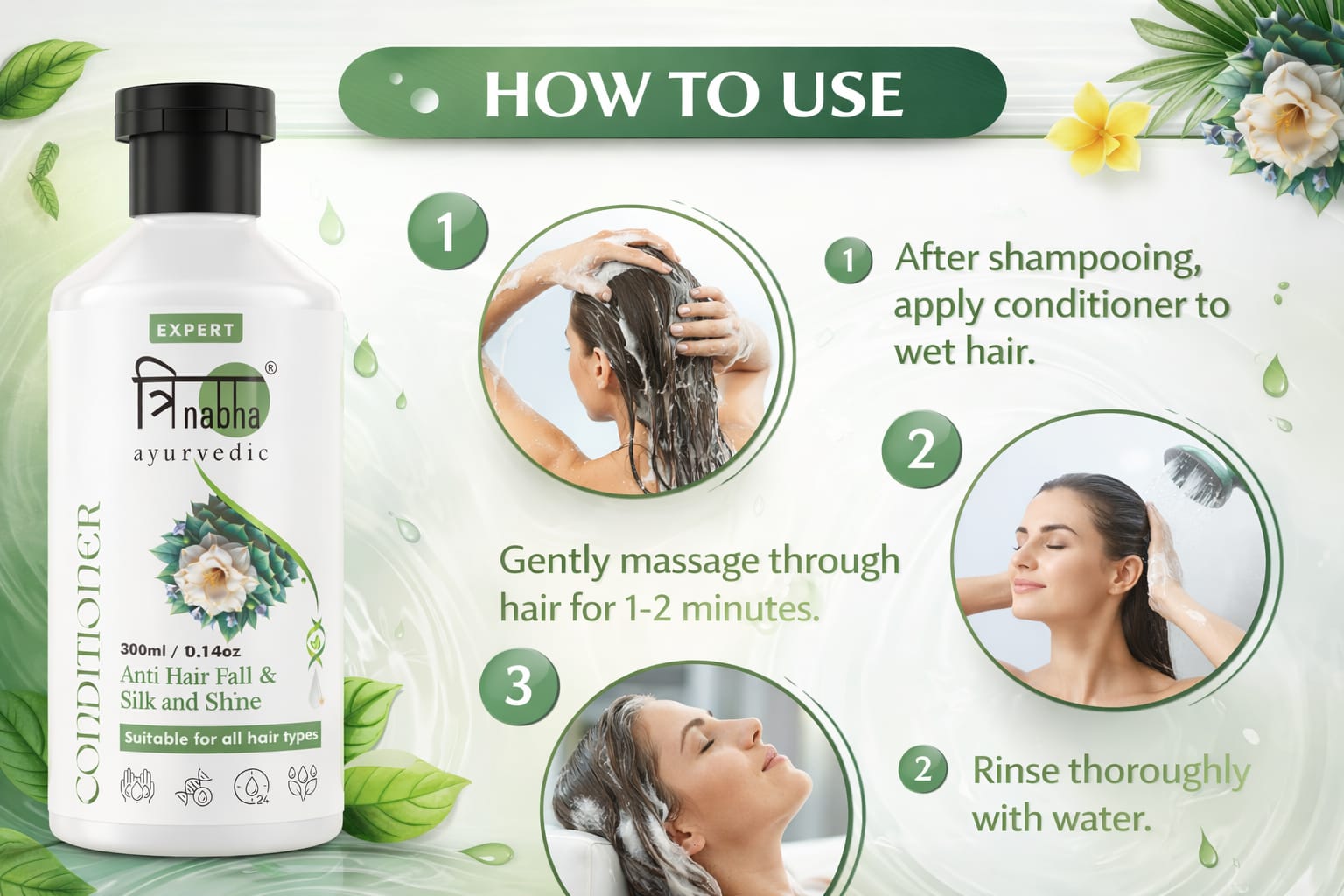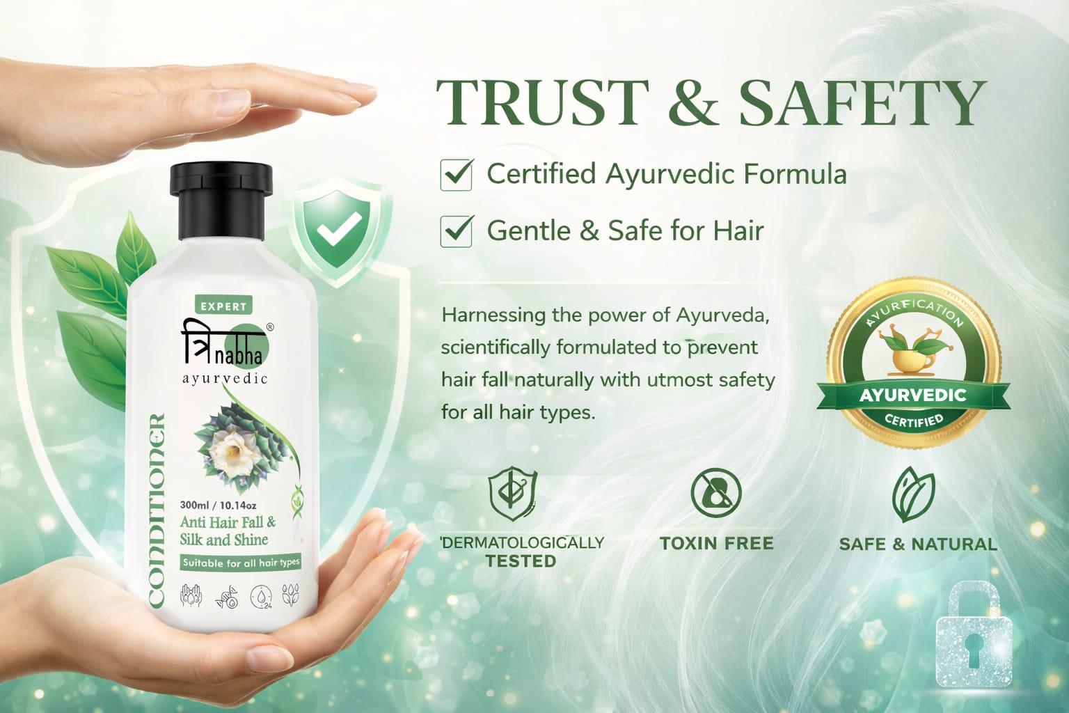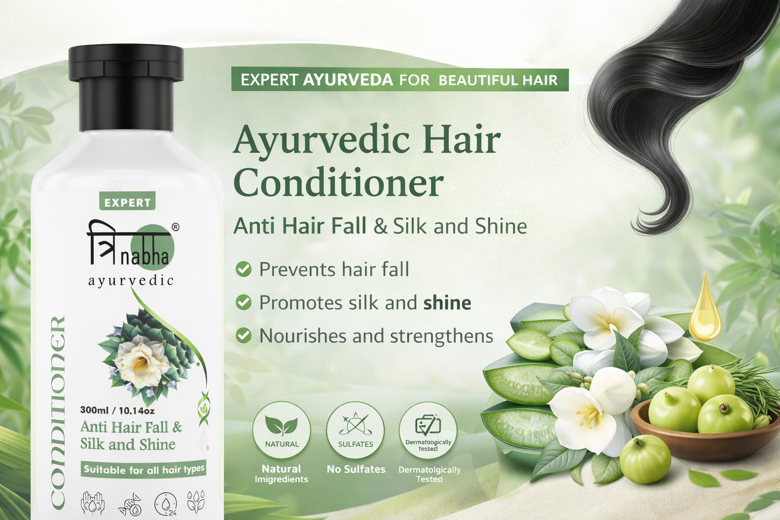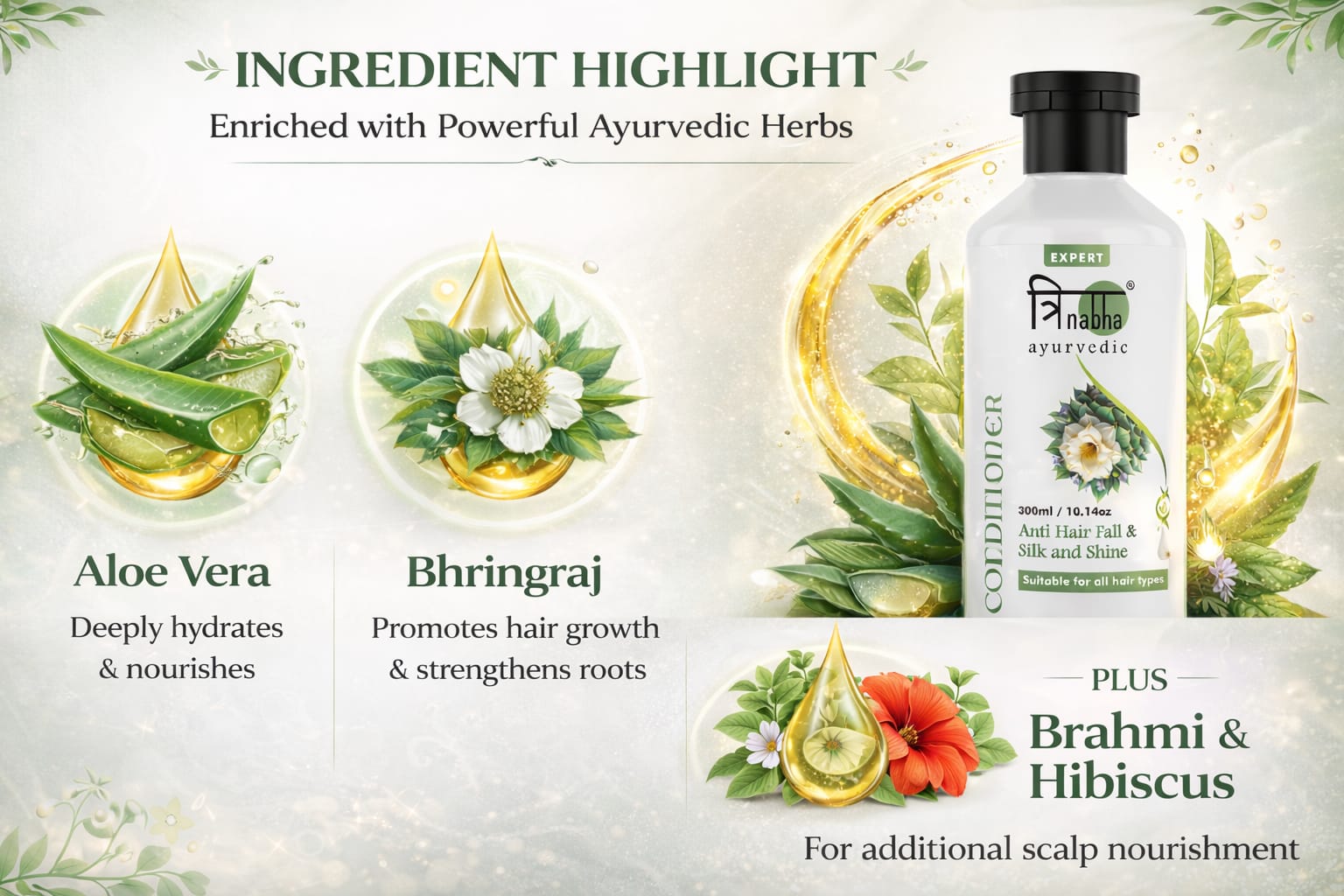 Trinabha Ayurvedic Anti Hair Fall & Silk and Shine Conditioner is a deeply nourishing hair care formula enriched with Ayurvedic ingredients to strengthen hair, reduce breakage, and restore natural softness and shine. It deeply conditions hair strands while improving manageability and smoothness.