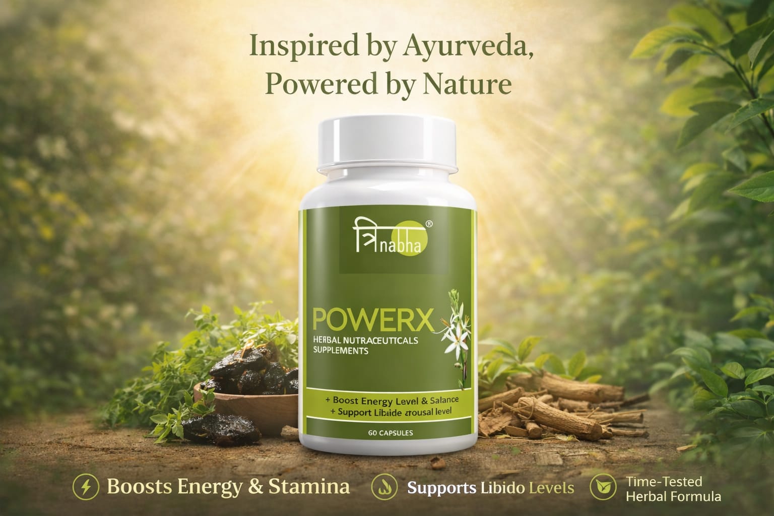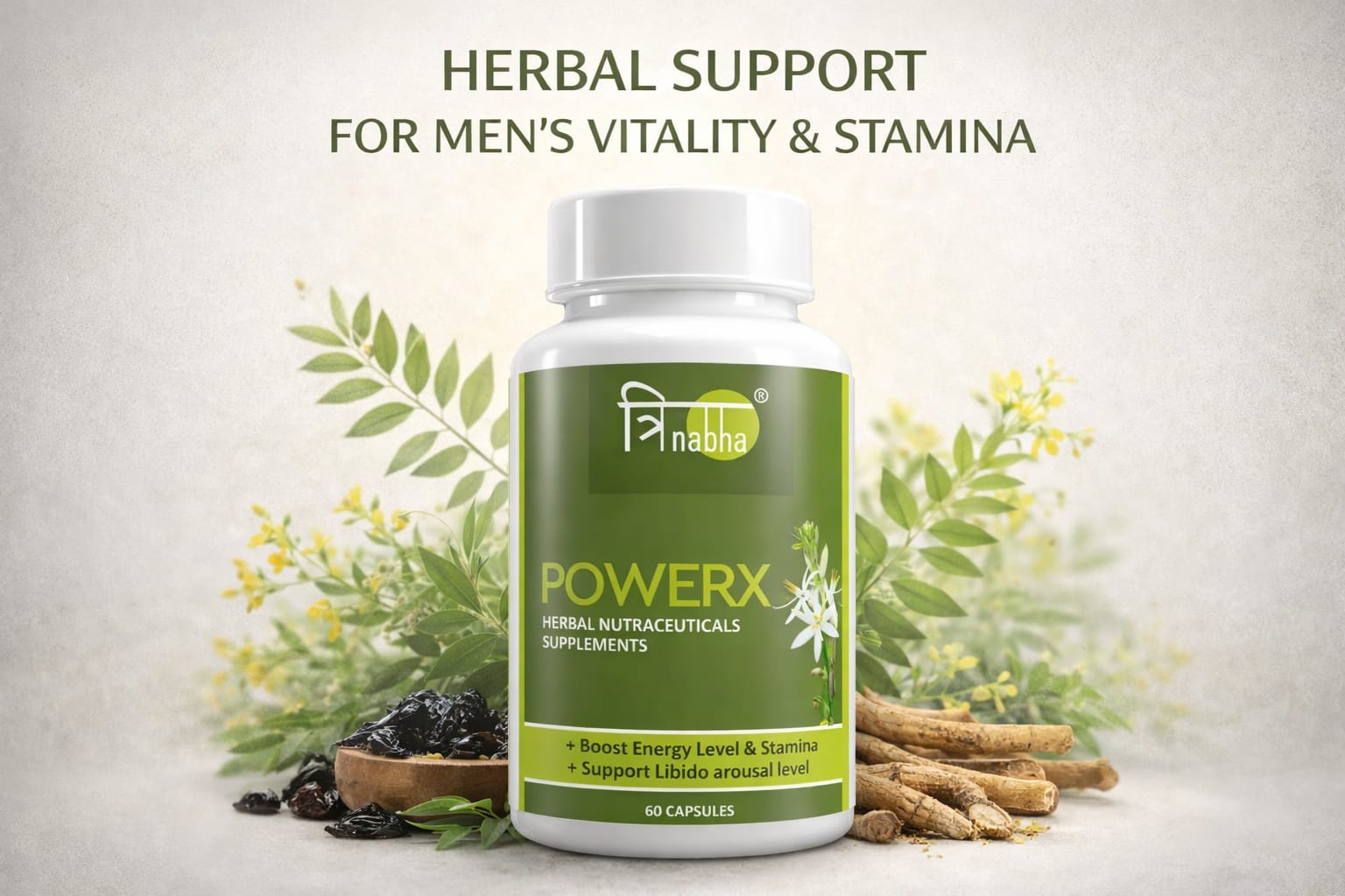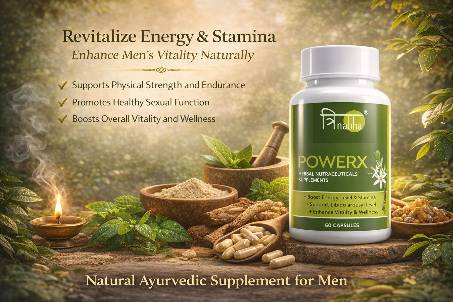 Trinabha PowerX is a scientifically formulated Ayurvedic supplement combining powerful herbs like Ashwagandha, Safed Musli, Gokshura, and Kaunch Beej to naturally boost stamina, energy, vitality, and overall performance for men.