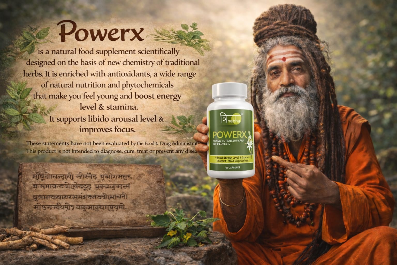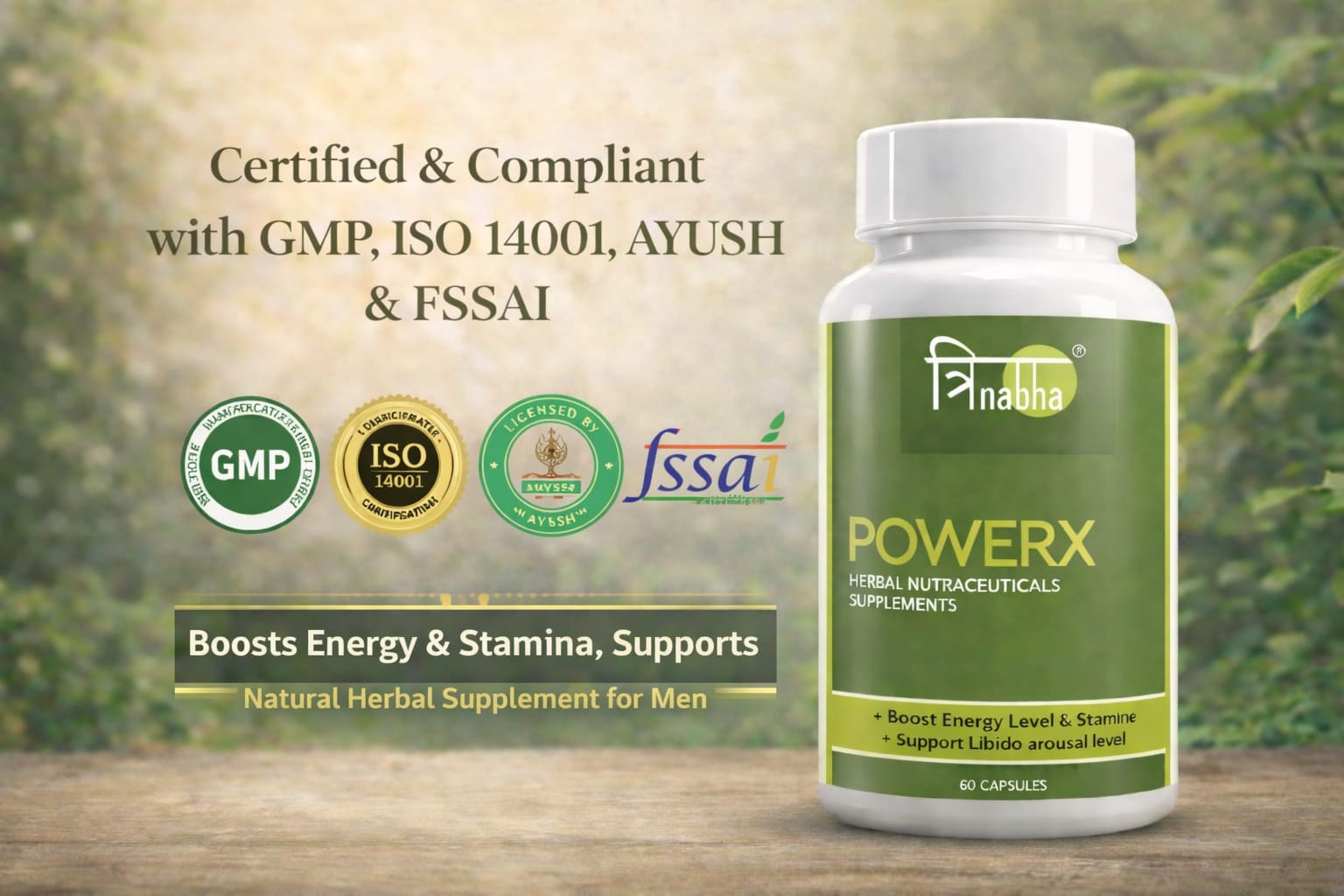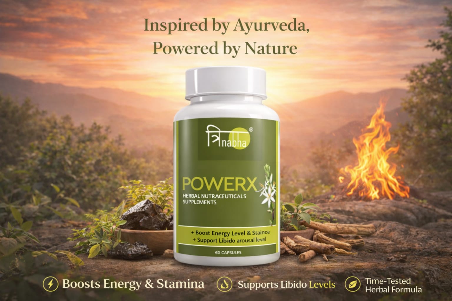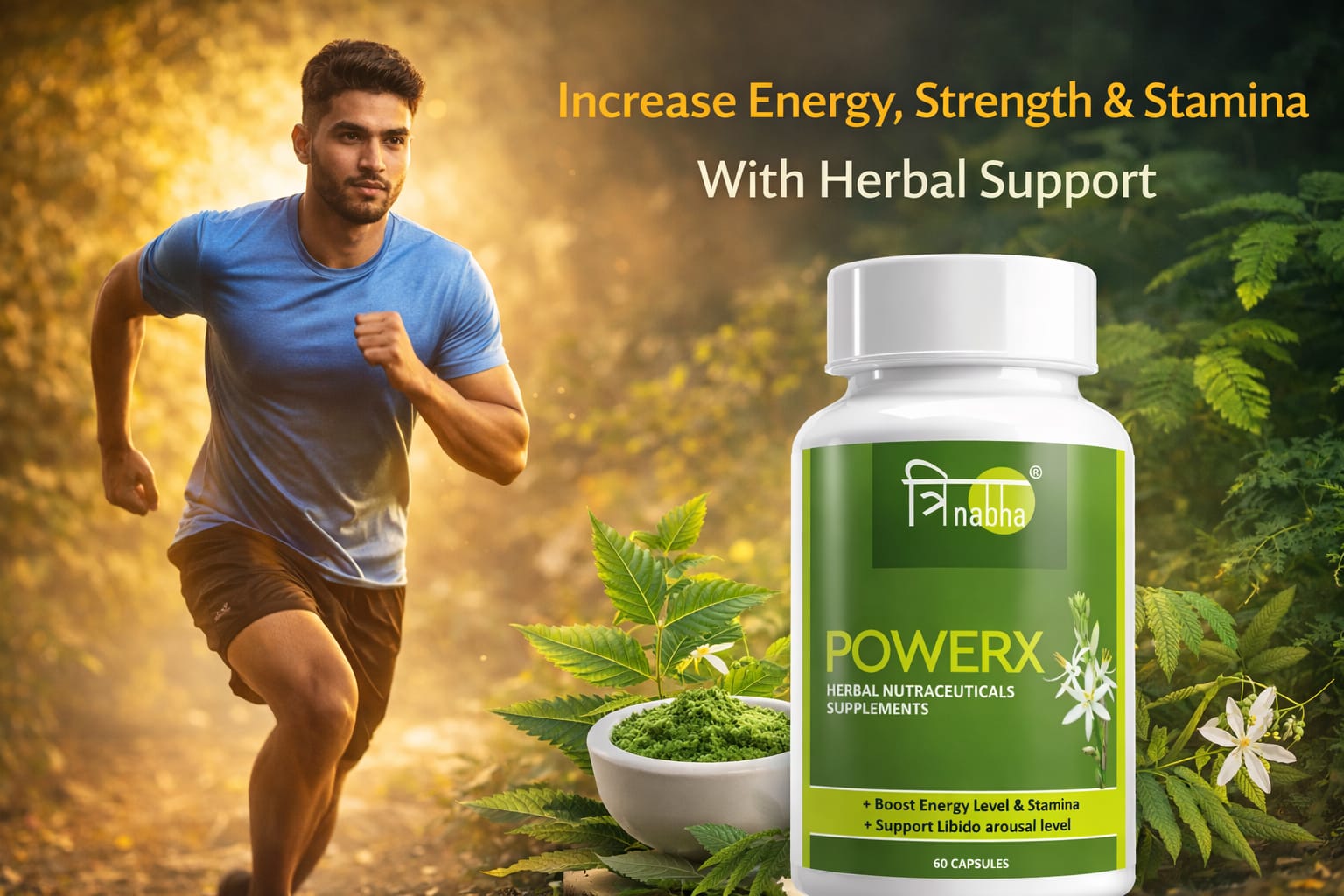 Trinabha PowerX is a scientifically formulated Ayurvedic supplement combining powerful herbs like Ashwagandha, Safed Musli, Gokshura, and Kaunch Beej to naturally boost stamina, energy, vitality, and overall performance for men.